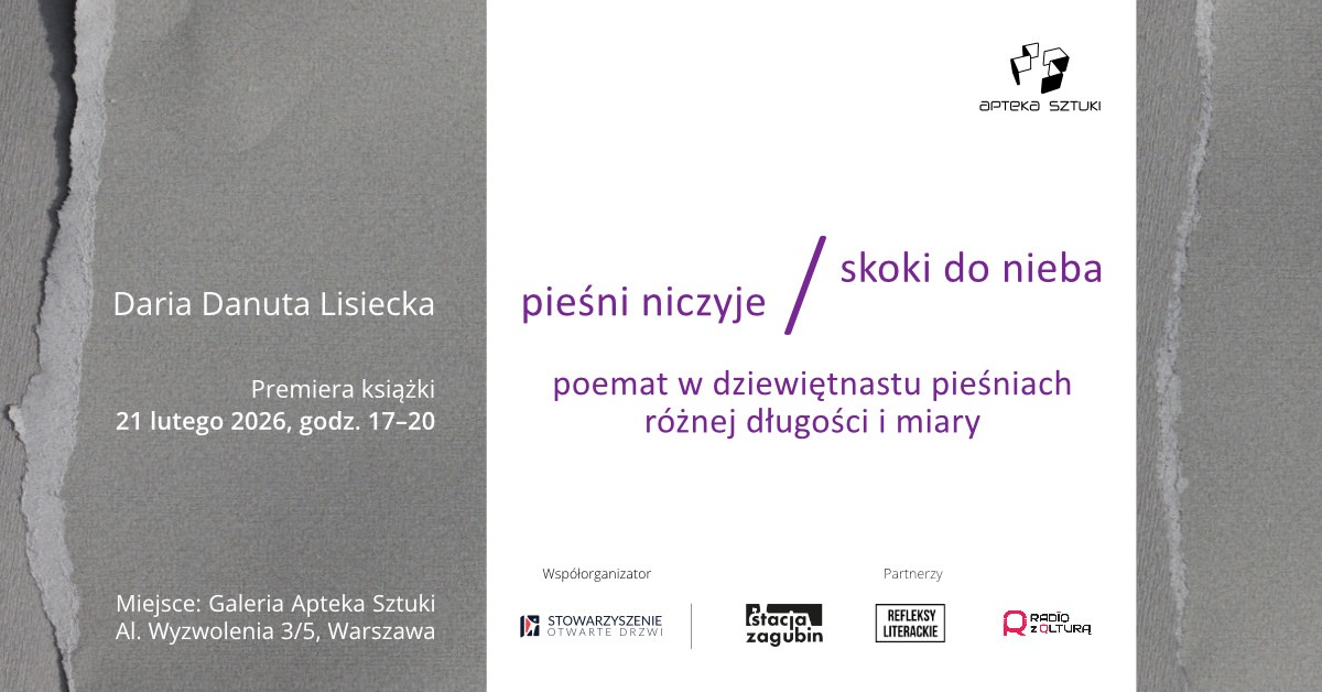 Dziewiętnaście pieśni [skoków do nieba], dziewiętnaście spotkań/rozstań, ogników wtopionych w powietrze gęste i białe jak białe wiersze. Daria Danuta Lisiecka zabiera nas na spotkanie z niezwykłą artystką, Małgorzatą Starowieyską [albo jej rewersem] i robi to w sposób niemalże mistyczny.
