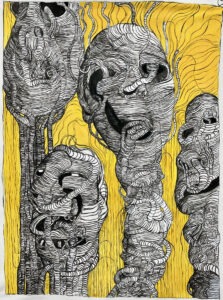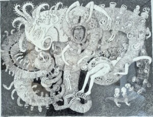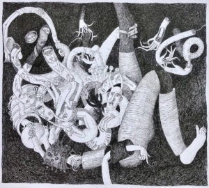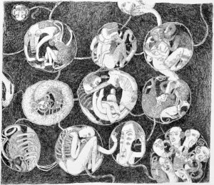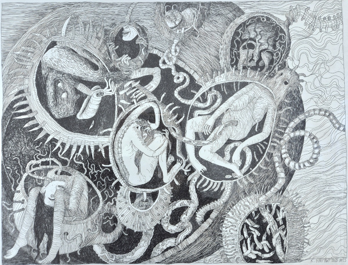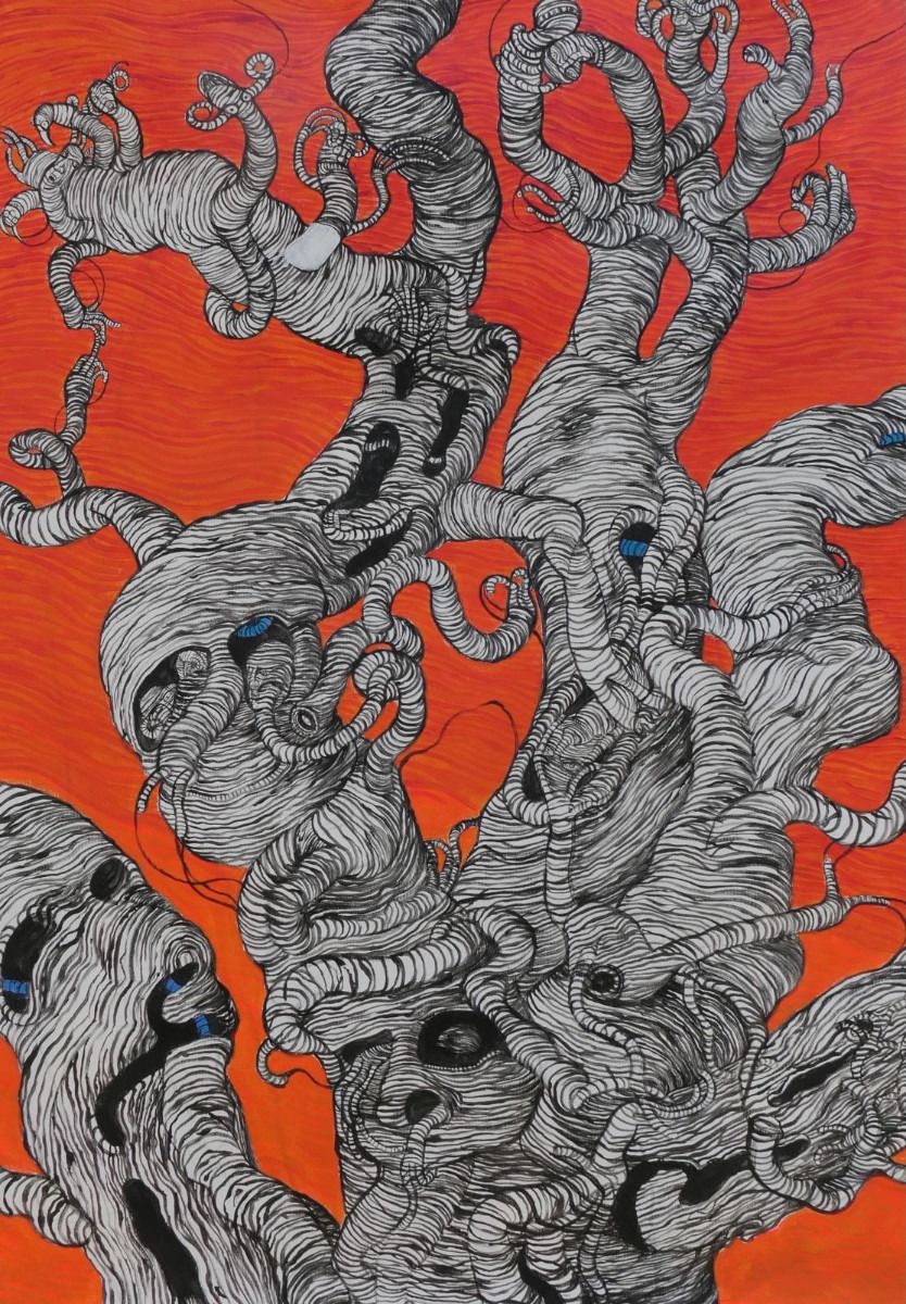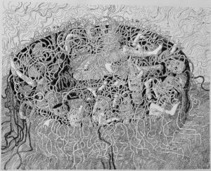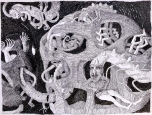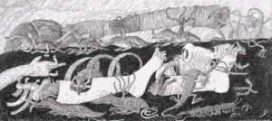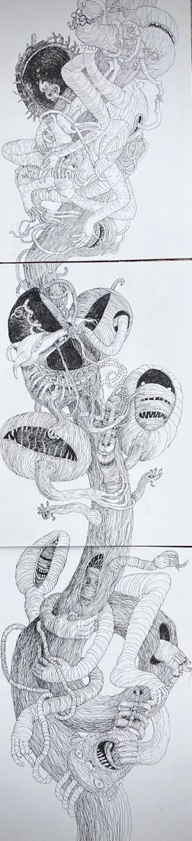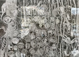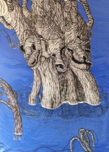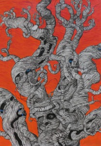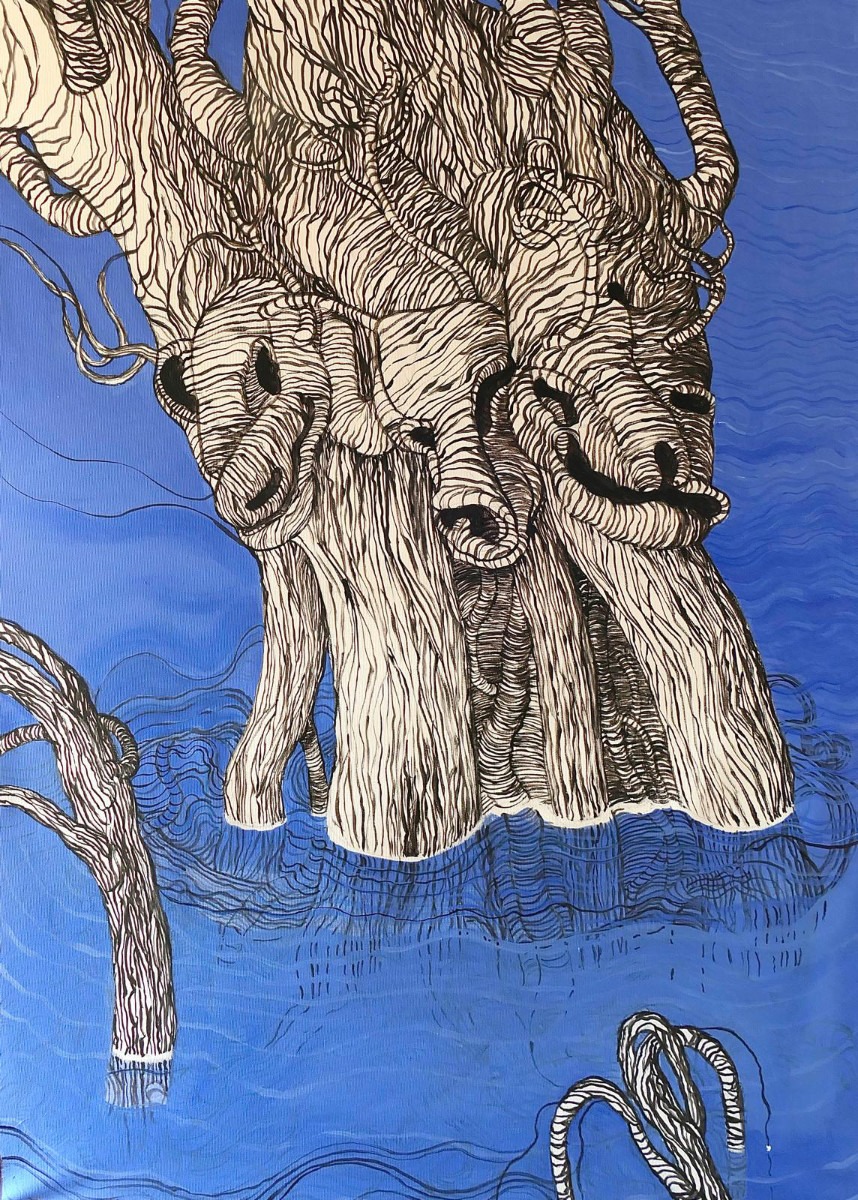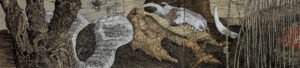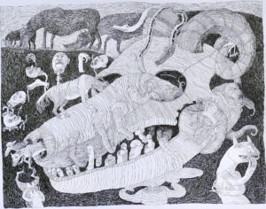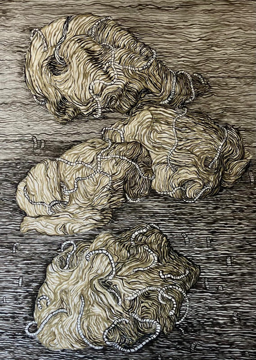 są i motywem, i światem samym w sobie. Robal – istota marginalna, często wypierana z pola widzenia – staje się symbolem podstawowych procesów życia i umierania: transformacji, rozkładu, ciągłości. Kompostu. Dla Artystki najważniejsza jest kreska – tłumaczy świat natury na kunsztownie dopracowany rysunek. W podobny sposób Minojczycy przetwarzali na abstrakcyjną kreskę otaczającą ich naturę. Klimat i krajobraz wyspy, surowy, skalisty, pełen kontrastów oraz jej historia, naznaczona nieustannym ruchem między powstawaniem i rozpadem, zmieniły i nadal zmieniają Artystkę – co sama przyznaje – w innego człowieka.